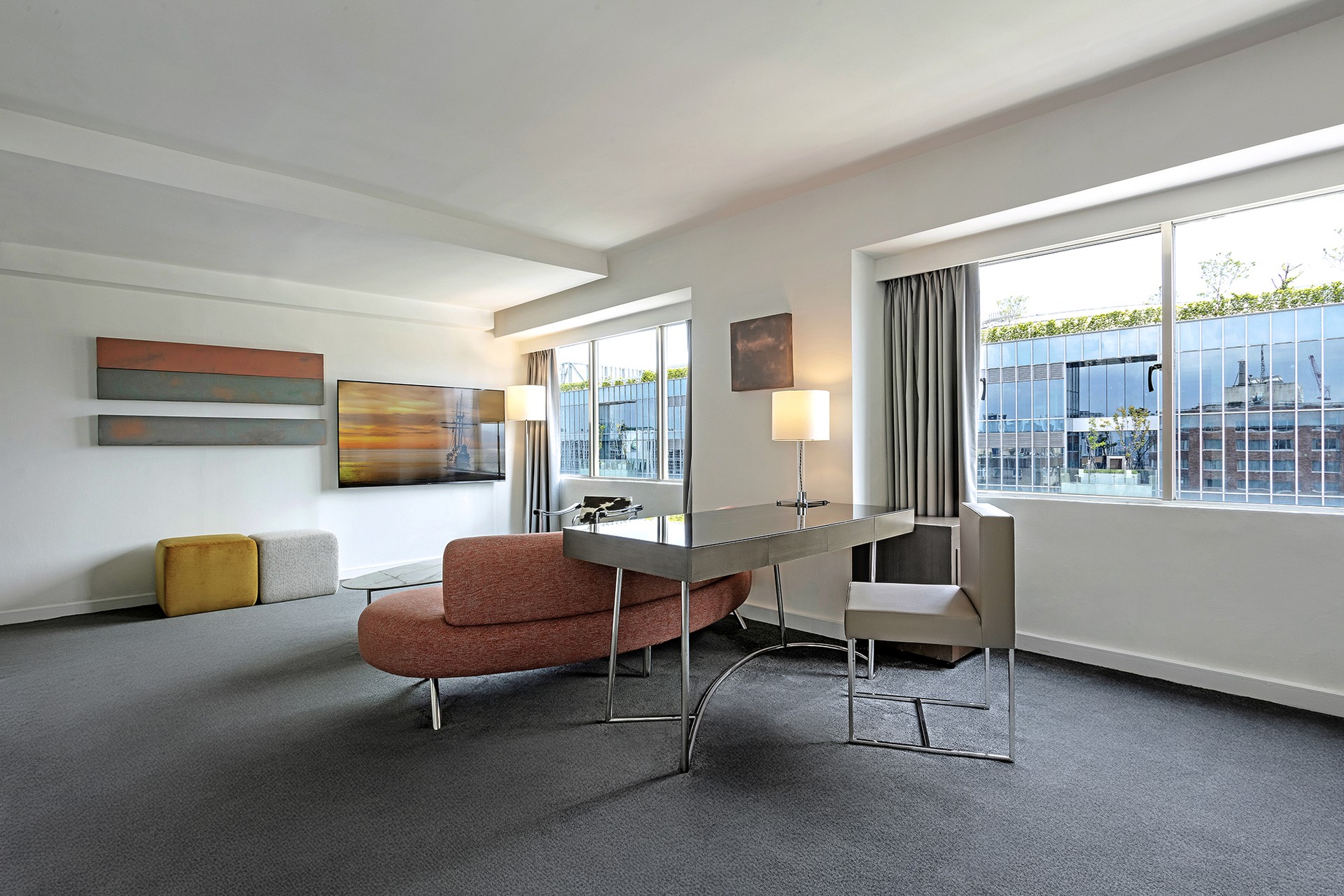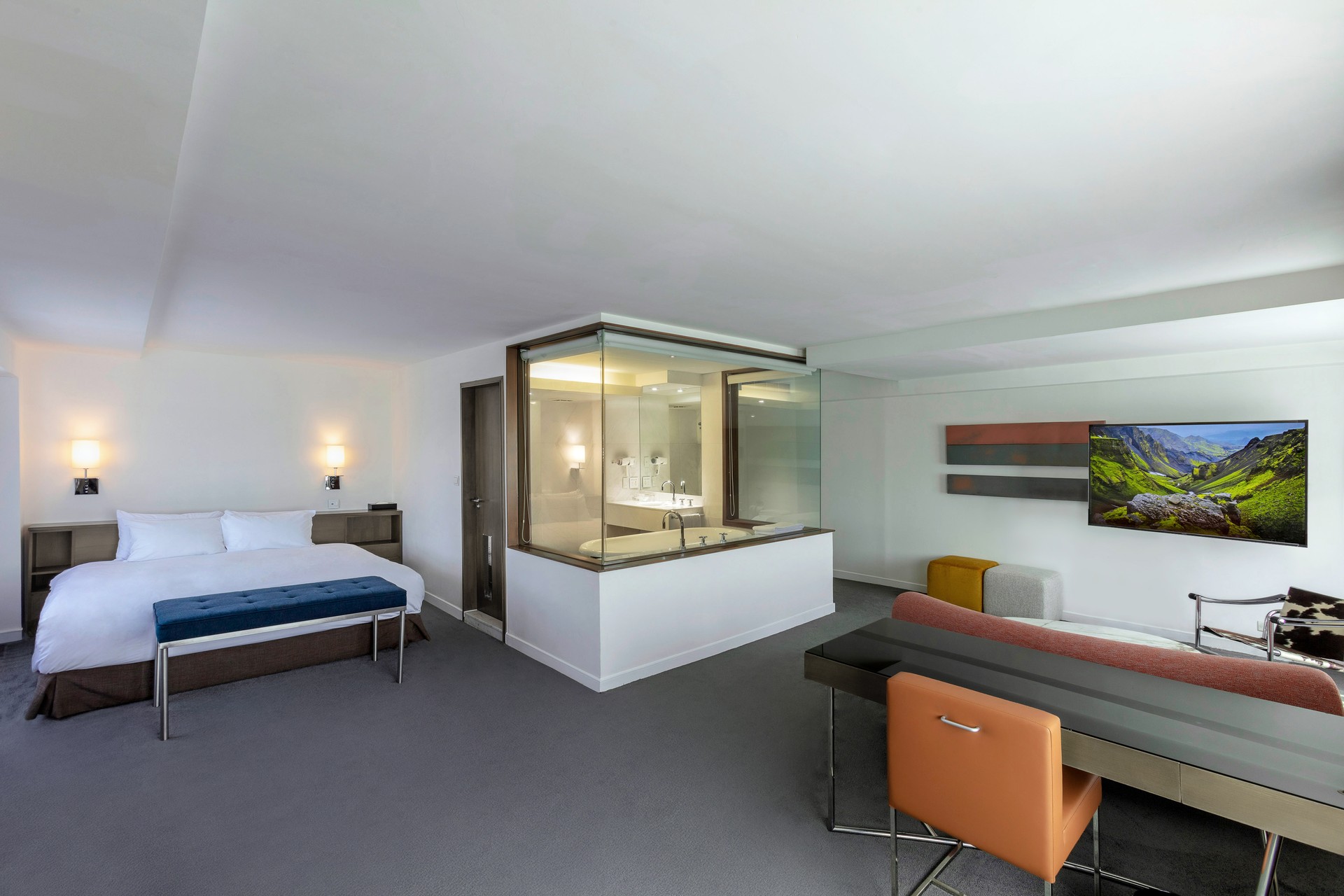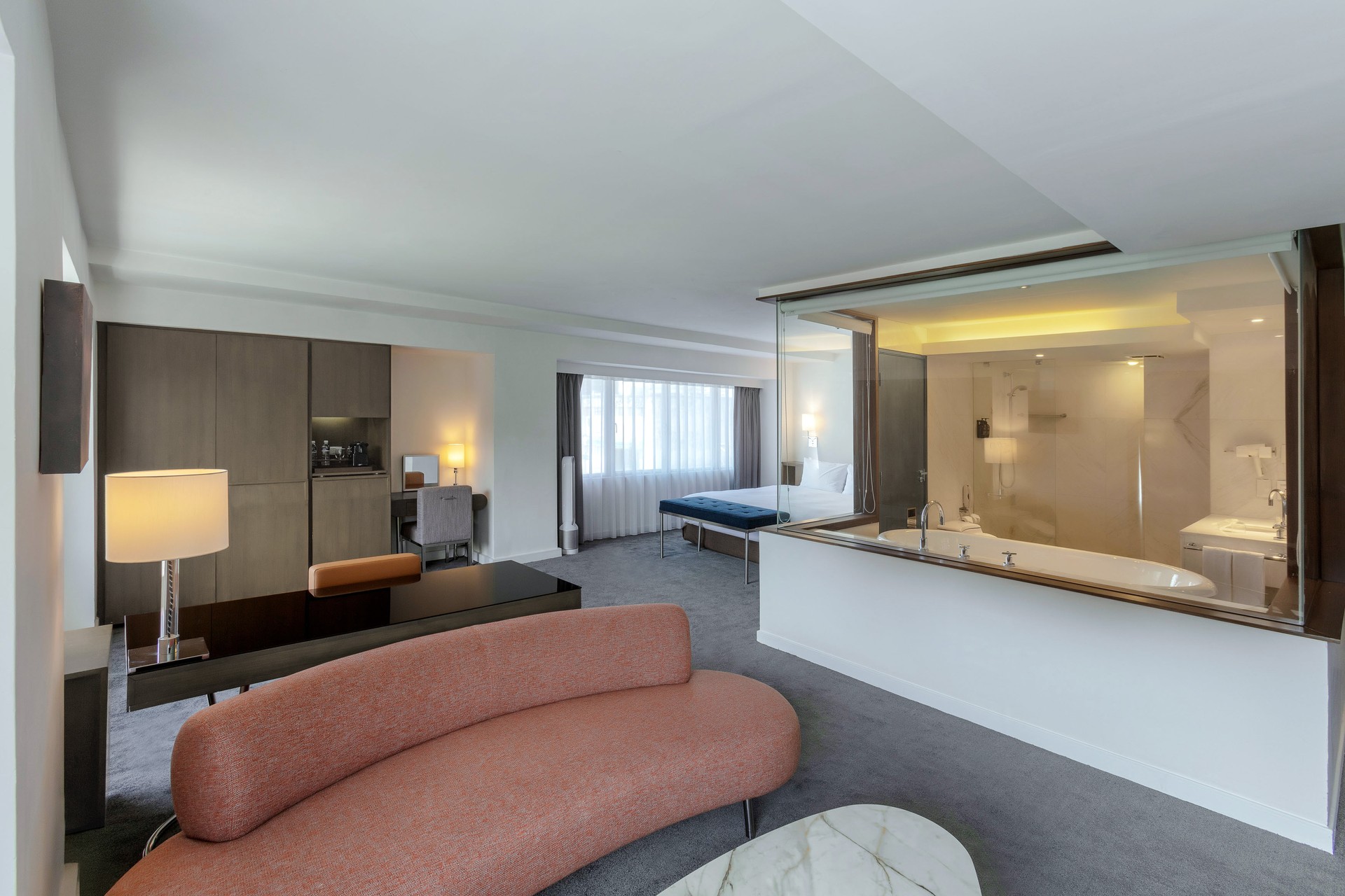 The suite features spacious combination of living room and bedroom, creating distinct zones for work and relaxation. The atmosphere strikes a perfect balance between elegance and warmth, making it ideal for business meetings or leisurely unwinding.